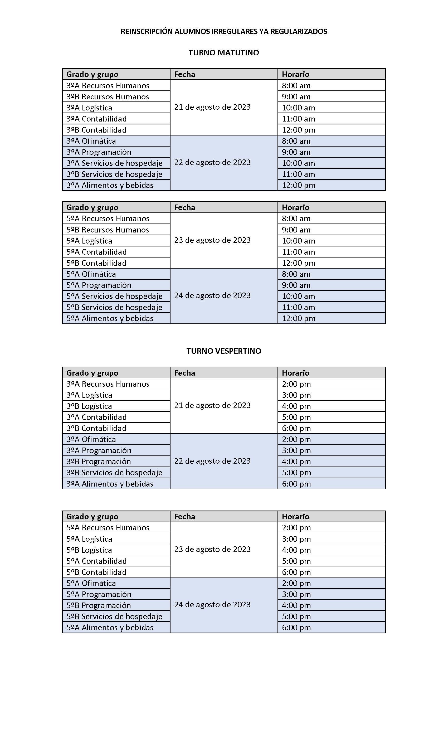 1. Desde el Lunes 21 al jueves 24 de agosto de 2023 se reinscriben alumnos irregulares.